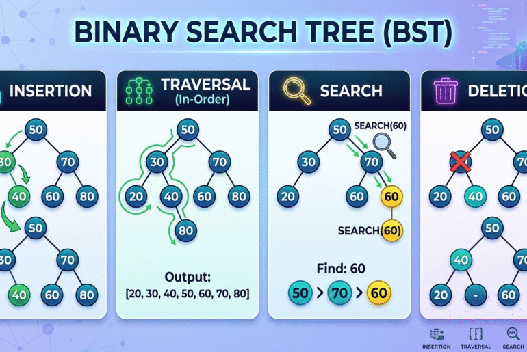 Binary Search Tree (BST): Insertion, Traversal, Search & Deletion – Complete Guide Table of Contents Introduction to Binary Search Tree…