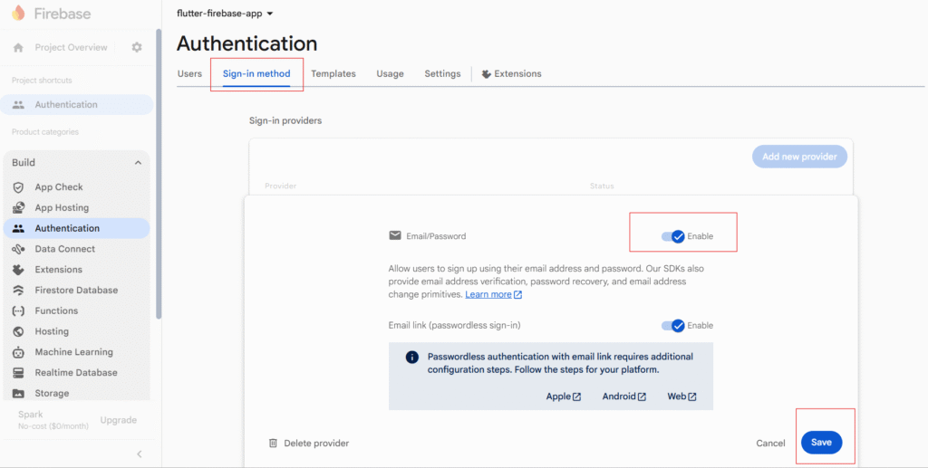 Ensure both the “Enable” and “Email Link (passwordless sign-in)” switches are checked (or at least the first one for basic sign-up).