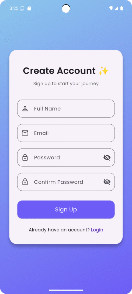In this practical lab tutorial, you will learn how to implement AlertDialog, Custom Dialogs, SnackBars, and Toast Messages in a Flutter application. These components help create a professional and user-friendly interface, similar to the login and signup screens shown above.