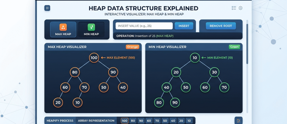 Heap Data Structure Explained with Max Heap, Min Heap, Insertion, Deletion & Priority Queue Introduction When dealing with large datasets or systems where priority matters—like scheduling tasks or processing urgent requests—efficiency becomes critical. This is where the heap data structure proves its value. Rather than keeping data fully sorted (which is expensive), heaps maintain just … Continue reading Lesson 21: Heap Data Structure Explained with Max Heap, Min Heap, Insertion, Deletion & Priority Queue